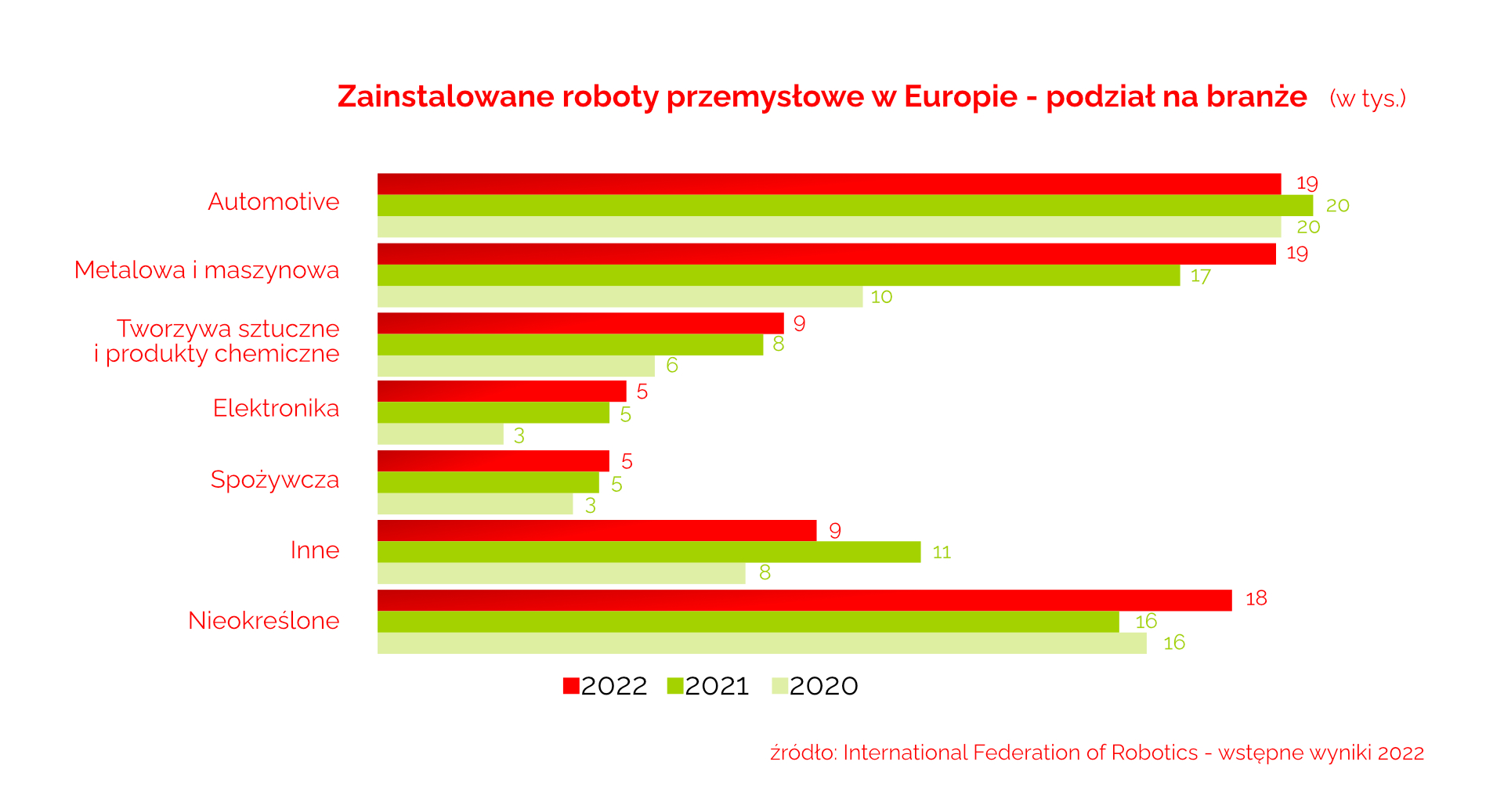Najwięcej robotów w 2022 roku zakupiła branża metalowa i maszynowa – 599 sztuk. Co ciekawe, pierwszy raz od dłuższego czasu, z najwyższego stopnia podium spadła branża motoryzacyjna (538 jednostek). Ostatecznie jak porównamy ilość zainstalowanych robotów rok do roku, to mamy w Polsce spadek o 11%. Rekord z 2021 roku nie został więc pobity, natomiast nadal utrzymuje się na wysokim poziomie. Po tym spadku moglibyśmy stwierdzić, że nasza pogoń za światem jest zbyt ociężała, jednak może to być spowodowane w dużej mierze niepewną sytuacją polityczno-gospodarczą w naszym regionie oraz napływem pracowników bardziej skłonnych do zatrudnienia w sektorach produkcyjnych. Zobaczymy, jak ilość robotów zmieni się w bieżącym roku.