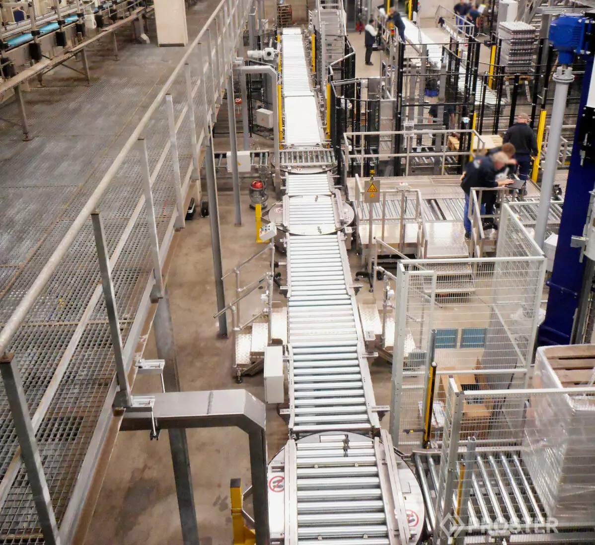 Zastosowane przenośniki: Użyto do tego celu niskich przenośników rolkowych oraz obrotnic (na wysokości 100mm od posadzki). Celem była współpraca z paleciakami, czyli niskimi wózkami paletowymi, które mają ograniczoną możliwość podnoszenia palety. Dzięki takiemu rozwiązaniu, w całym systemie depaletyzacji, nie było potrzeby użycia kilku wind do palet. Obrotnice zostały zastosowane, aby precyzyjnie umiejscowić oraz nadać odpowiednią orientację palecie do procesu zrobotyzowanego.